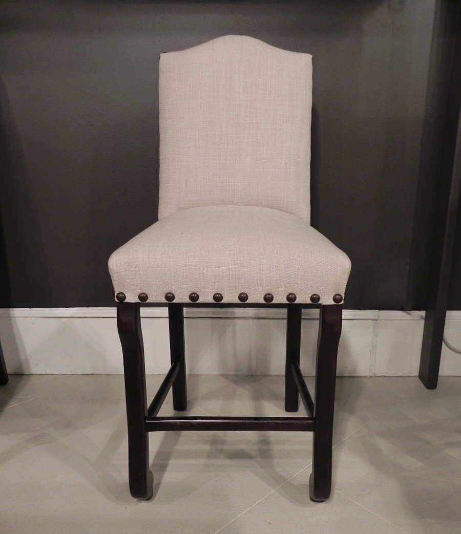 Deveraux upholstered counter stool. Shown in Fabric: No longer available. Leg Leg Finish: Tobacco. Made in the USA. Other Styles Available: Arm Chair, Side Chair, Petite Side Chair, Tall Arm Chair, Tall Side Chair, Bar Stool, Lounge Bench