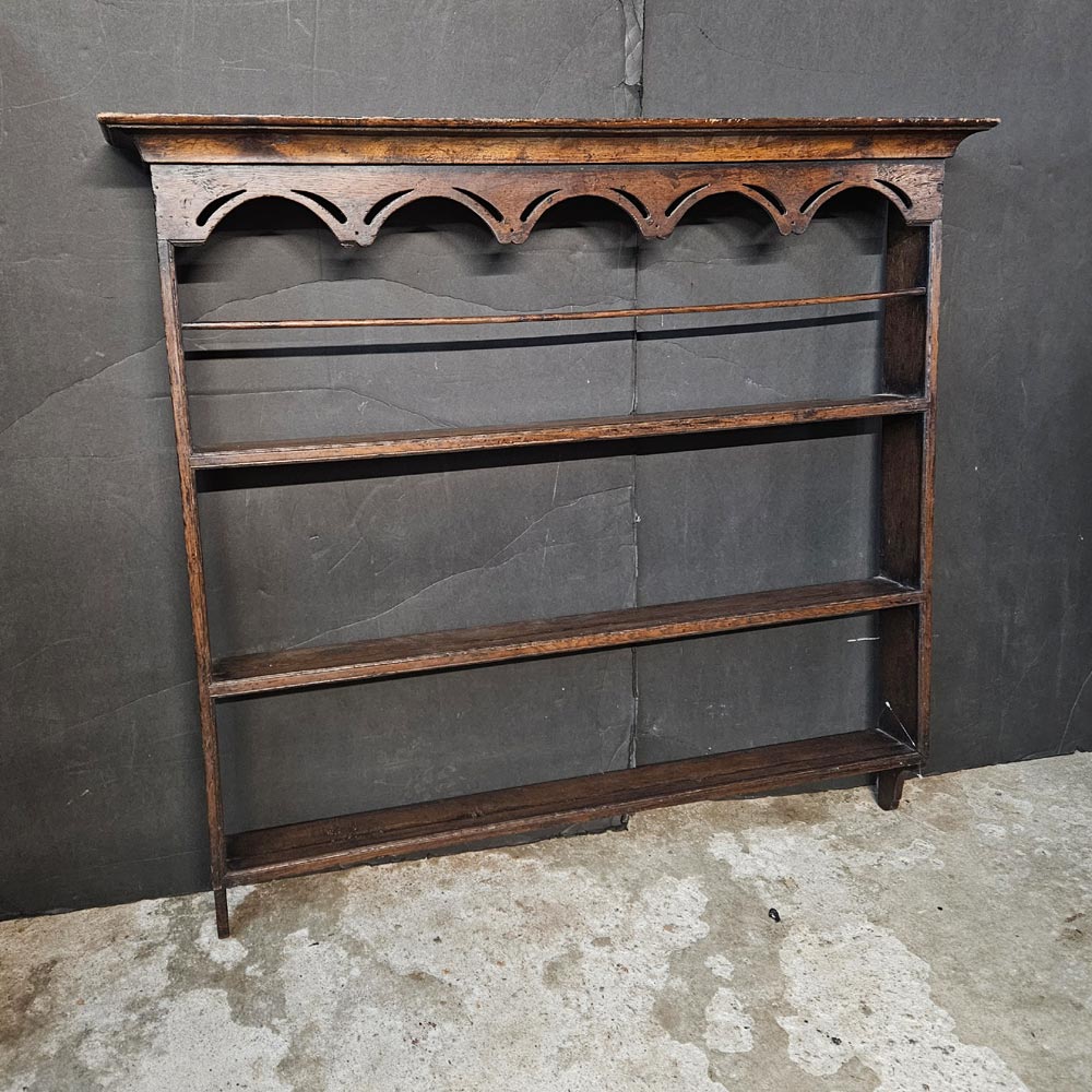 Oak hanging plate rack with 3 shelves, one with a rail, and a lovely shaped frieze. There are a small piece missing on the first arch in the frieze on the left side. Please note this is a vintage piece and will show signs of wear consistent with age and use that may include fading, marks, blemishes, splits, and other signs of aging. Please look at the photos as this counts as part of the item description. This item is sold as is, for more details and additional photos please contact us.